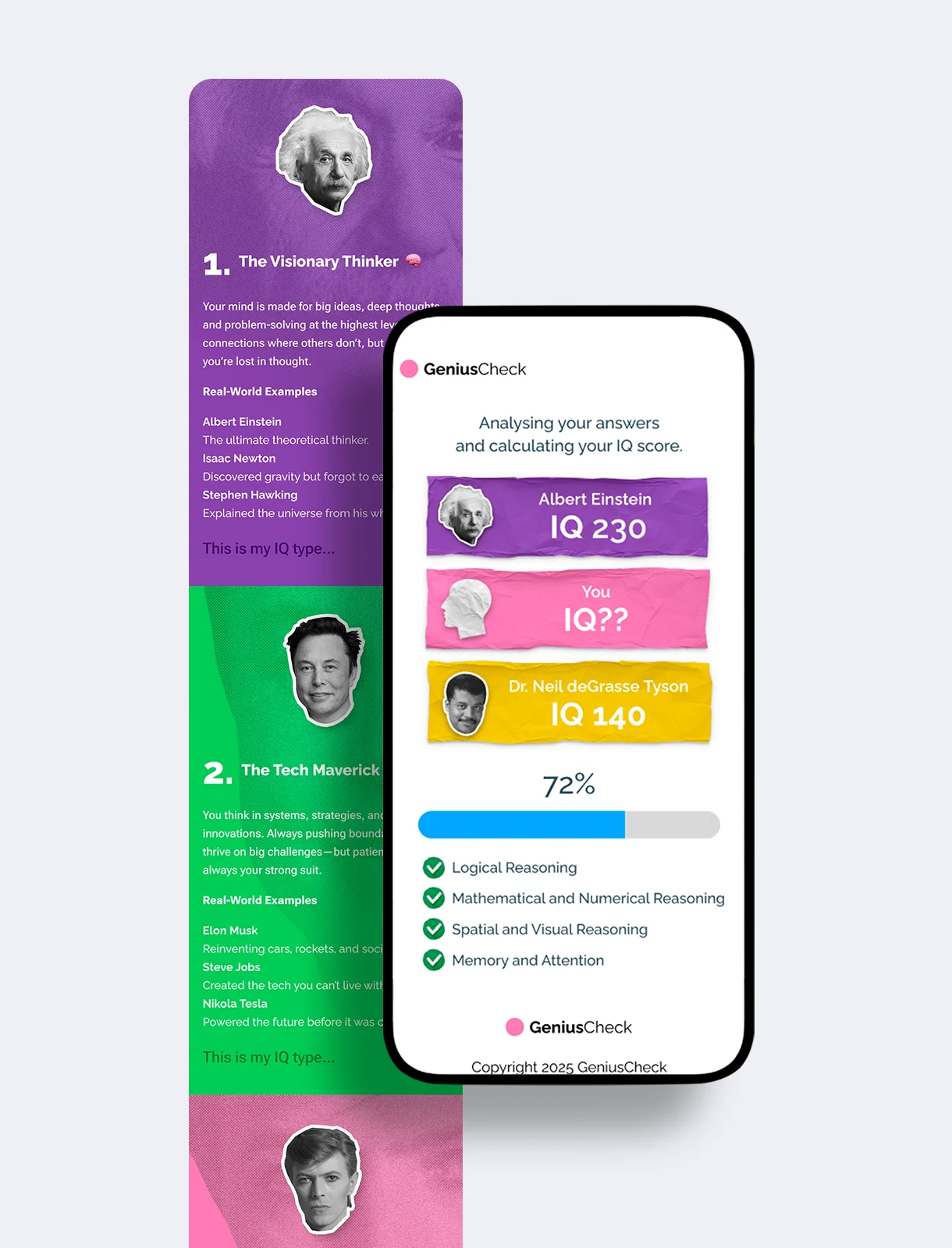 GeniusCheck is an interactive app designed to make intelligence playful and engaging. Through a series of visual challenges, puzzles, and personality-driven tests, users explore how their mind works and discover the type of thinker they are.