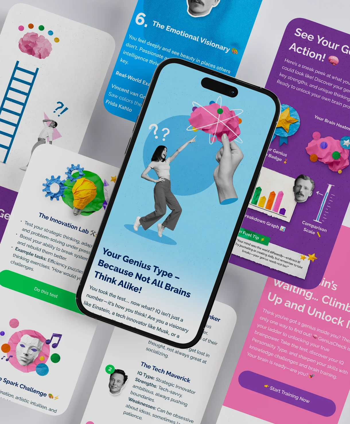 We created the full concept and digital experience, combining bold design, intuitive UI, and creative visuals to turn cognitive testing into something entertaining and accessible. The result is an app that encourages curiosity, learning, and a bit of healthy brain training along the way.