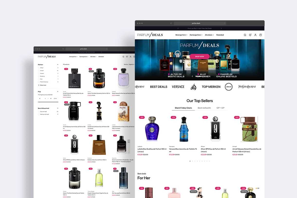 Parfum Deals was developed as a complete ecommerce and marketing concept around accessible luxury fragrances. The goal was to build a recognizable brand and a sales platform that performs across devices while supporting long-term growth through structured marketing.