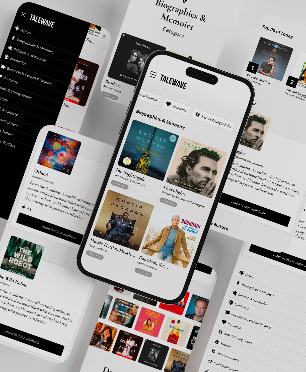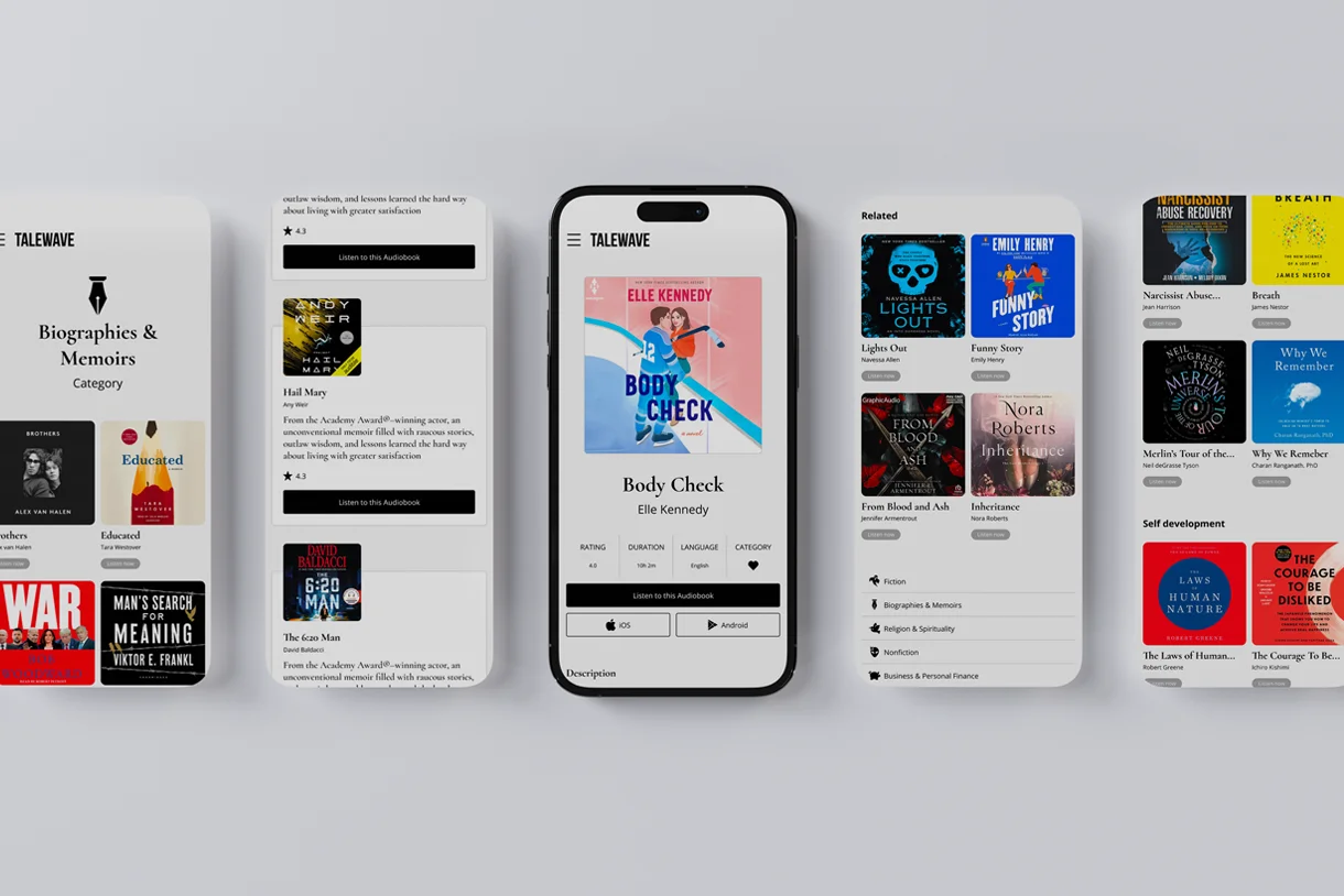 For Talewave we developed the branding and user experience for a modern audiobook platform. The design focuses on clarity and ease of use, helping users quickly explore categories, discover new titles, and start listening without friction. The result is a streamlined digital library where stories are always within reach. Talewave turns everyday moments like commuting, walking, or relaxing into opportunities to dive into a new book.